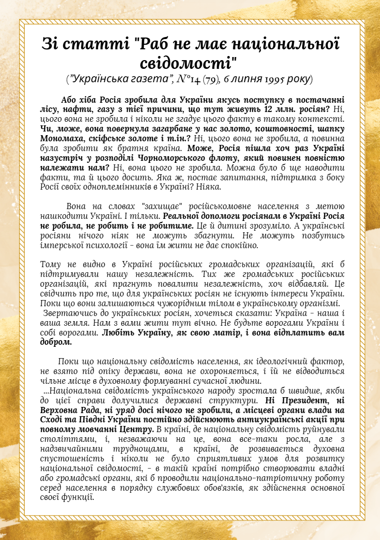 From the article “A slave has no national consciousness” (“Ukrainian Newspaper”, No. 14 (79), July 6, 1995) Istoriya ta Kultura Aug 18 Written By Maria Torska PAGE 01 PAGE 02 PAGE 03 PAGE 04 PAGE 05 🚀 Let's Talk About This? – Join My Community ukrainska-istoriyanatsionalna-svidomistukrainska-kulturaukrainski-tradytsiyiistoriya-ukrainyukrainski-hramotipatriotyzm-ukrainyukrainska-movaukrainske-naslidokkulturna-spadshchyna Maria Torska